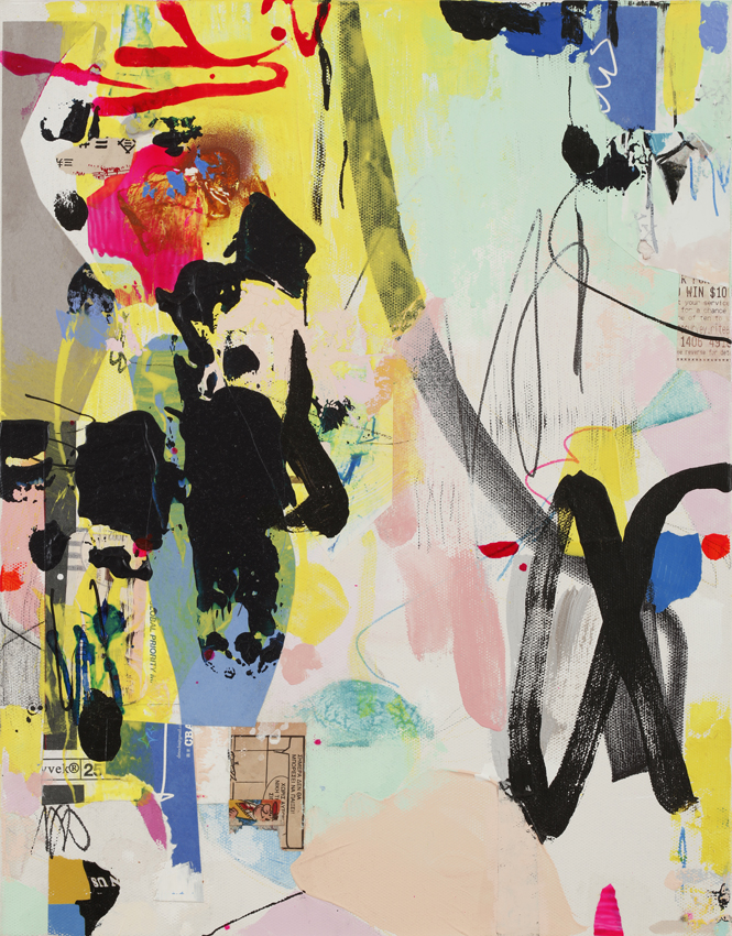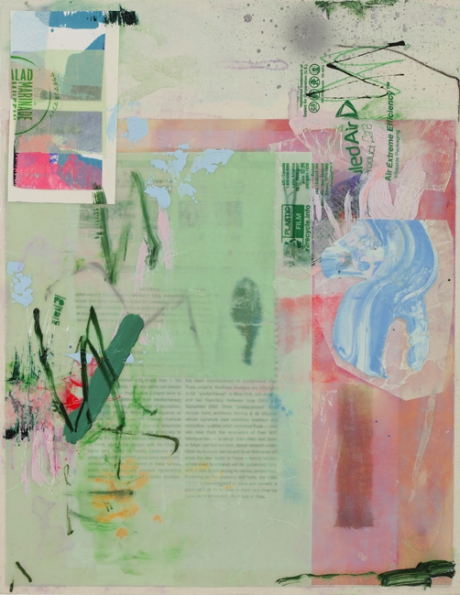 アクリル絵具などの画材やファウンドマテリアルのコラージュを